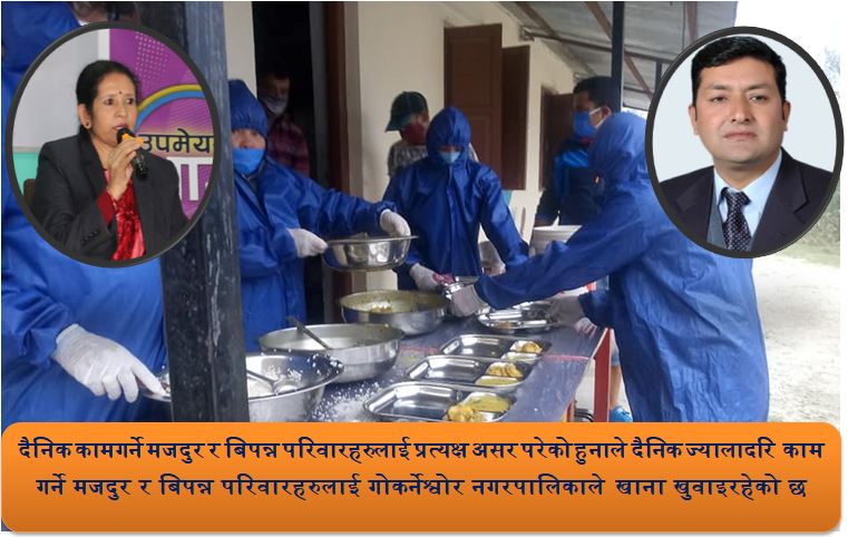देश भरि कोरोना भाइरसको महामारी भए संगै लक डाउनका कारण दैनिक कामगर्ने मजदुर र बिपन्न परिवारहरुलाई प्रत्यक्ष असर परेको हुनाले दैनिक ज्यालादरि काम गर्ने मजदुर र बिपन्न परिवारहरुलाई गोकर्नेश्वोर नगरपालिकाले खाना खुवाइरहेको छ |नगरपालिकाको प्रत्यक वडामा नगरपालिकाको र स्थानीय समाजसेवी हरुको सहयोगमा खाना खुवाइएको हो |