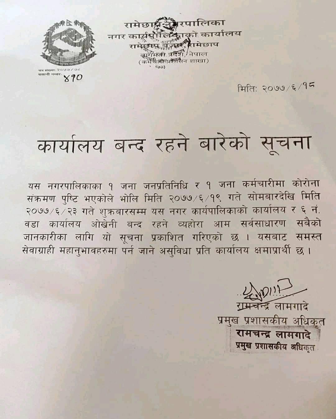 आइतबार नगरपालिकाका एक जना वडाअध्यक्ष सहित कार्यालय सहयोगी एक महिला कर्मचारीमा कोरोना संक्रमण पुष्टि भएको थियो । वडा अध्यक्ष सहितका व्यक्तिलाई कोरोना संक्रमण पुष्टि भएसँगै नगरपालिकाले आफ्नो सेवा ५ दिनको लागि बन्द गरेको रामेछाप नगरपालिकाका नगरप्रमुख नर बहादुर थापामगरले जानकारी दिए ।