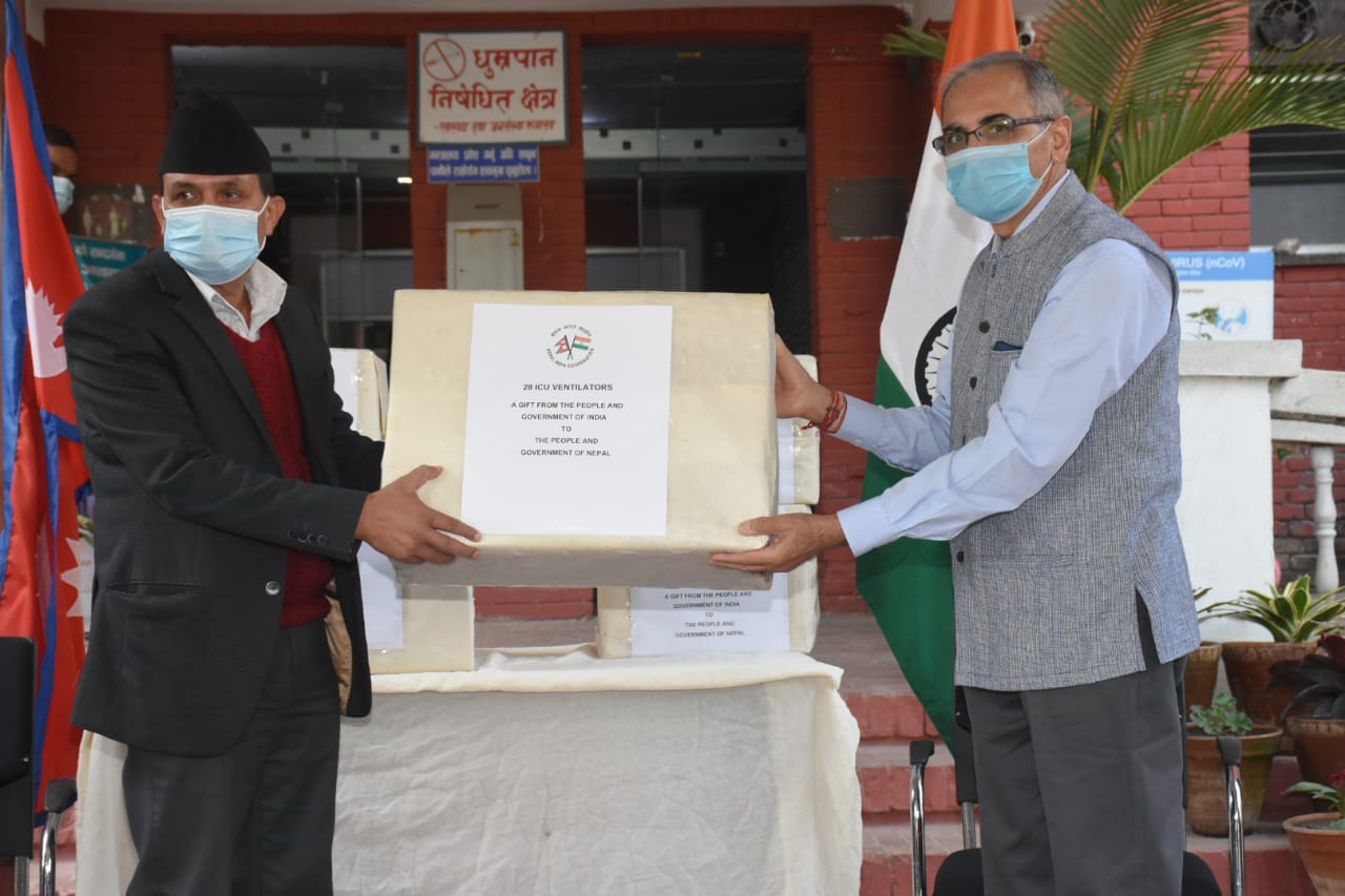 २०७७ कार्तिक २३ गते भारत सरकारको तर्फबाट नेपालका लागि भारतीय राजदूत क्वात्राद्वारा नेपालका माननीय स्वास्थ्य तथा जनसंख्या मन्त्री भानुभक्त ढकाललाई २८ वटा आईसीयु भेन्टिलेटर उपहार स्वरुप प्रदान । महामारीले निम्त्याएको चुनौतीको सामना गर्न भारतले नेपाललाई गर्दै आएको सहयोगको निरन्तरता pic.twitter.com/XL11qWVp81