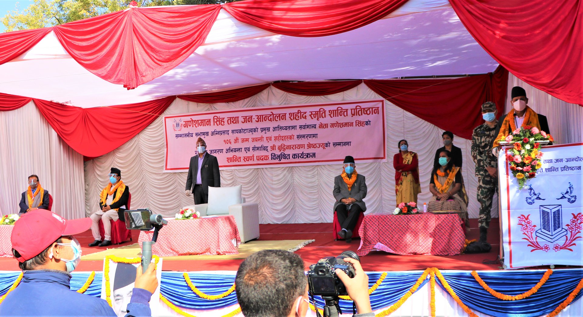 सोमबार भएको गणेशमान सिंहको १०६ औं जन्मजयन्ती एवम् सहिदहरुको संस्मरणमा आयोजित जनआन्दोलन स्मृति स्वर्णपदक २०७७ सुशोभन तथा सम्मान कार्यक्रममा सहभागिता जनाउदै उनले माल्यार्पण गरेका हुन्।