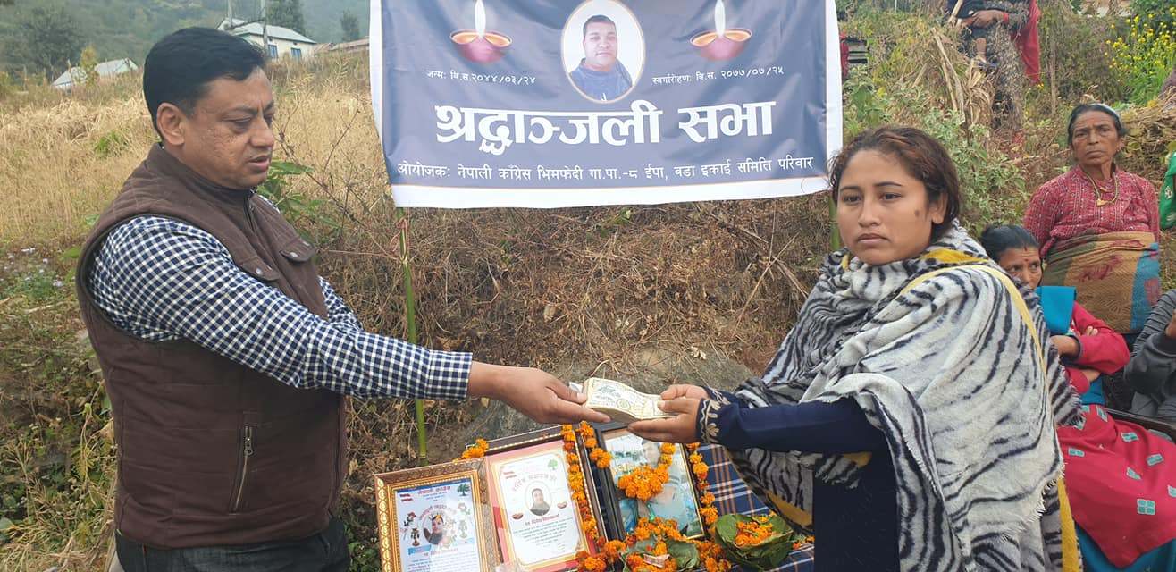 काठमाडौं । नेपाली काङ्ग्रेस मकवानपुरको भिमफेदी गाउँपालिका -८ इपा वडा इकाईले वडा अध्यक्षका उम्मेदवार स्वर्गीय दिपेश बिस्वकर्माको परिवारलाई आर्थिक सहायता प्रदान गरेको छ ।