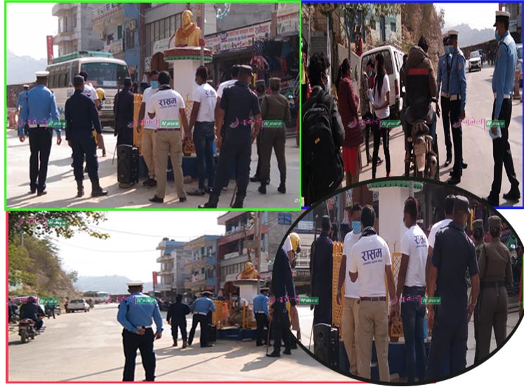 मंगलबार अभियानको पहिलो दिन बस, मोटर साइकल, पौदल यात्रा गर्नेहरु माक्स नभएकालाई माक्स दिइ र माक्स भएकालाइ उचित तरिकाले मास्क लागाउँ भनेर माइकिङग गरेका थिए ।