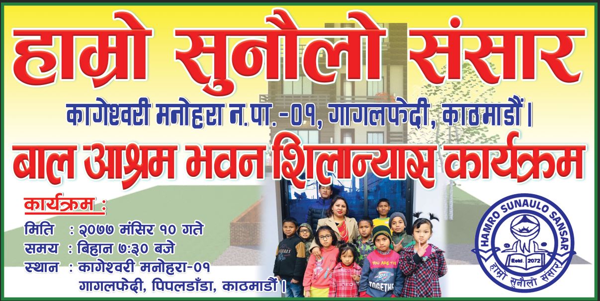 काठमाडौँ । गोकर्नेश्वोर नगरपालिका वडा नं ६ मा रहेको हाम्रो सुनौलो संसार बालाश्रमको भवन भोलि कगेश्वोरी मनोहरा नगरपालिका वडा नं १ को गागलफेदीमा महिला बालबालिका तथा जेष्ठ नागरिक मंत्री माननीय लिलानाथ श्रेष्ठको हातबाट शिलान्यास हुने भएको छ |