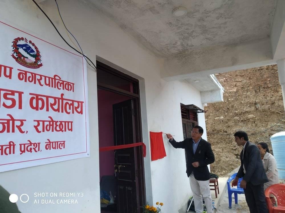 रामेछाप । रामेछाप जिल्लाको रामेछाप नगरपालिका प्रमुख नरबहादुर थापामगरले वडा नं ७ सुकाजोरको हिलेपानीमा आज उद्घाटन गरेको वडा कार्यायलको बाँकि काम पूरा गर्न नगरले सहयोग गर्ने बताएका छन् । सोमबार नवनिर्मित भवन उद्घाटन गर्दै उनले यस्तो बताएका हुन् । उनले भवन बनेकोमा खुसी ब्यक्त गर्दै वडा बासीमा खुसी ब्यक्त गरे । बाँकि काम पूरा गर्न नगरपालिकाले सहयोग गर्ने प्रतिवद्धता जनाएका हुन् ।