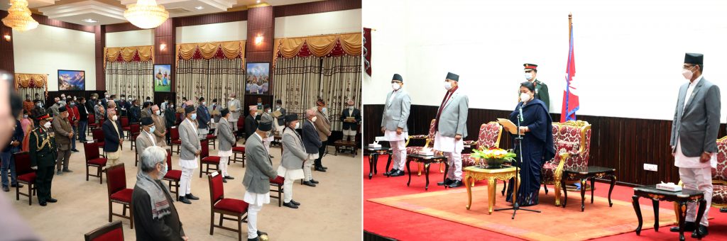 साथै,राष्ट्रपति विद्यादेवी भण्डारीले नवनियुक्त मन्त्रीलाई राष्ट्रपति भवनमा आयोजित विशेष समारोहका बीच नेपालको संविधानको धारा ८० बमोजिम आ-आफ्नो पदको पद तथा गोपनीयताको शपथ ग्रहण गराइएको राष्ट्रपति कार्यालयका सहाय प्रवक्ता केशव प्रसाद घिमिरेले जारी गरेको प्रेस विज्ञप्तिमा उल्लेख गरिएको छ ।