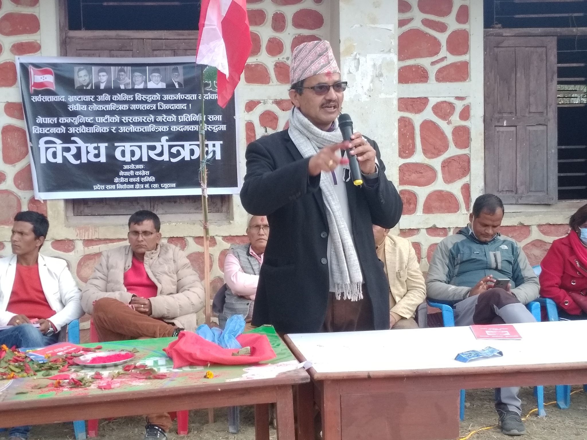 बिराेध सभाका प्रमुख अतिथि राष्ट्रिय याेजना अायाेगका पुर्व उपाध्यक्ष काङ्ग्रेस नेता डाक्टर गाेबिन्दराज पाेख्रेलले बिकास गर्नु धर्म हाे बिकास सन्ततिहरुका लागि गर्नु पर्दछ उनिहरुले भबिष्यमा सुख पाउनछन र अासिर्बाद दिन्छन त्यहि अासिर्बाद नै धर्म हाे तर कम्युनिष्ट काे हाउगुजि पढेका बामपन्थिले सरकारकाे नेतृत्व गरेर बिकास गर्न सकेनन। काेराना भाईरस काेभिड १९ का कारण जन्ता तहस नहस भएका बेला प्रधानमन्त्रीले संसद बिघटन गरेर जन्तालाई सडकमा आउन बाध्य बनाएकाछन।