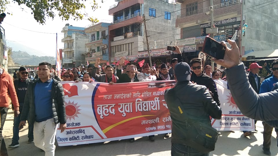 राष्ट्रिय युवा संघ नेपाल र अनेरास्वियू जिल्ला कमिटी संघले आयोजना गरेको बृहत युवा विद्यार्थी भेला मन्थलीको थापा चोकबाट मोटरसाईकल र्यालीसहित मदनआश्रित चोकबाट बृहत र्यालीसहित समन्वय समितिमा पुगेर कोणसभामा परिणत भएको हो ।