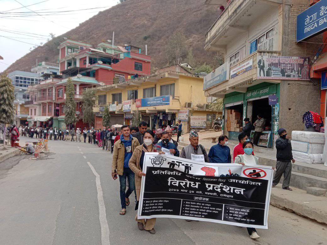 कांग्रेसको भातृ संस्था नेपाल टेड्र युनियन रामेछापको, नेपाल प्रेस युनियन रामेछाप, नेपाली कांग्रेस रामेछाप ,शिक्षक संघ रामेछापसहित तरुण दल रामेछाप, नेपाल विद्यार्थी संघ रामेछापको, किसान संघ रामेछापलगाएत कांग्रेसका सम्पूर्ण भातृ संस्थाहरुको आयोजनामा विरोध र्याली प्रर्दशन गरिएको हो ।