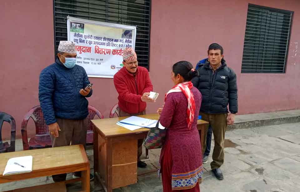 त्यस्तै नगरपालिकाले दुध उत्पादन गरेर बिक्री गर्ने कृषकहरु २१७ जनालाई तथ्याङ्कको आधरमा २ लाख ९६ हजार ९ सय १६ लिटरको ५ लाख ९३ हजार ८ सय ३३ रुपैयाँ प्रदान गरेको जुनेली न्युजलाई खड्काले बताए । सो रकम प्रतिलिटर २ रुपैयाँला दरले उपलब्ध गराइएको हो । नगरपालिकाले कृष र पशु पालनलाई प्रथामिकता दिदै आएको बताउदै आएको छ । यसरी नगरले प्रथम चौमासिकमा कूल ११ लाख ६२ हजार ५ सय ६४ रुपैयाँ कृषहरुलाई दिएको उनले बताए ।