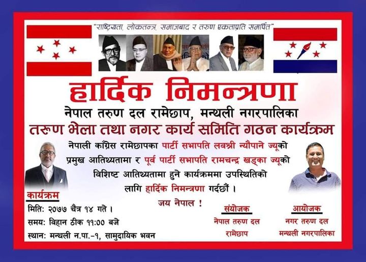 मन्थली नगर तरुणको आयोजना र नेपाल तरुण दल रामेछापको संयोजनामा हुन लागेको भेला तथा नगर कार्य समिति गठन कार्यक्रम स्थगित गरेको हो । कार्यक्रम मन्थलीस्थित सामुदायिक भवनमा राखिएको थियो ।