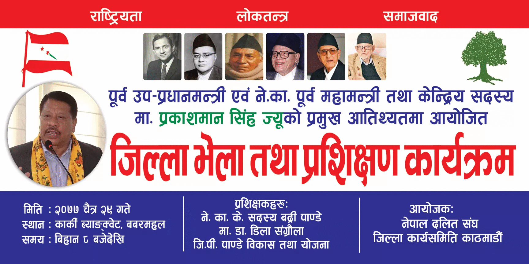 नेपाली कांग्रेसका पूर्व महामन्त्री तथा केन्द्रीय सदस्य माननीय प्रकाशमान सिंह ज्यूको प्रमुख आतिथ्यतामा मिति २०७७ चैत २९ गते बिहान ८ बजे कार्की व्यानकेट बबरमहलमा नेपाल दलित संघ काठमाडौं जिल्लाले जिल्ला भेला तथा प्रशिक्षण कार्यक्रम आयोजना गर्ने भएको छ।