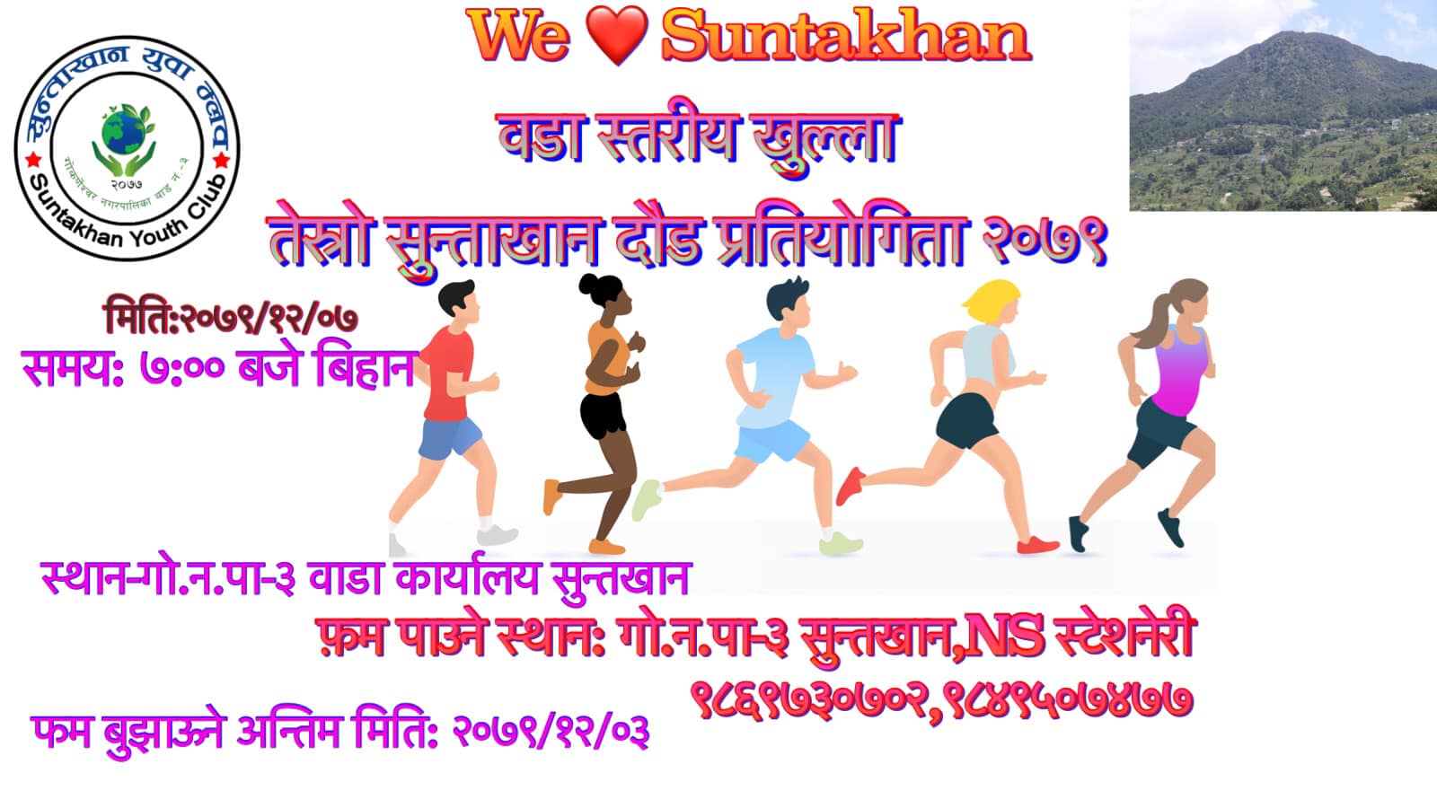 गोकर्णेश्वर नगरपालिका वडा नं ३ मा अबस्थित सुन्ताखान युवा क्लबले तेस्रो वडा स्तरीय सुन्ताखान दौड़ प्रतियोगिता गर्ने भएको छ | प्रतियोगिता २०७९ चैत ७ गते हुने भएको हो |