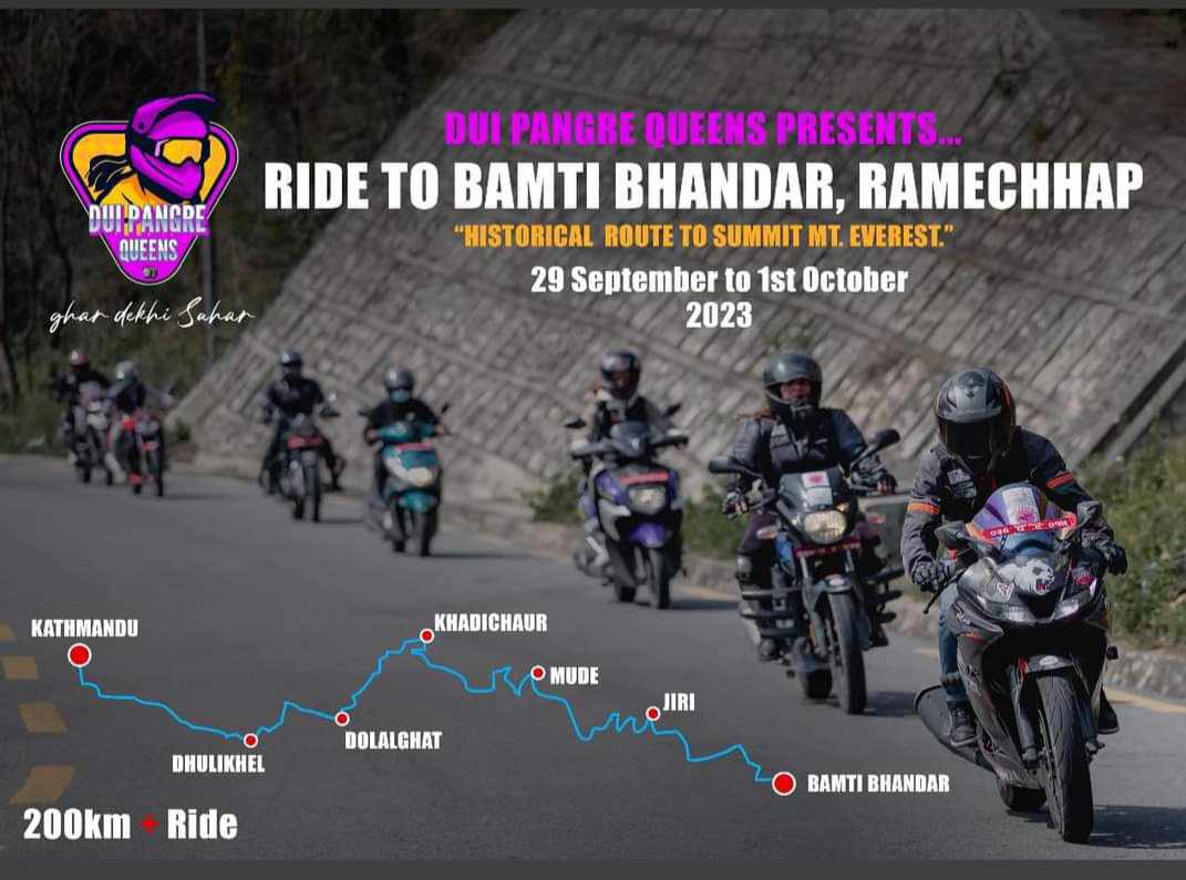 १० असोज, रामेछाप । रामेछापको बाम्तीभण्डारको पर्यटन प्रवर्द्धन गर्ने उद्देश्यले पहिलो पटक ‘दुई पाङ्ग्रे क्वीन्स’ ले मोटरसाइकल यात्रा (बाइक राइडर) गर्ने भएको छ । यो कार्यक्रममा सबै महिला/लेडीहरुले सहभागिता जनाउने छन् । कार्यक्रम असोज १२ गतेदेखि १४ गतेसम्म दुई दिने हुने छ ।