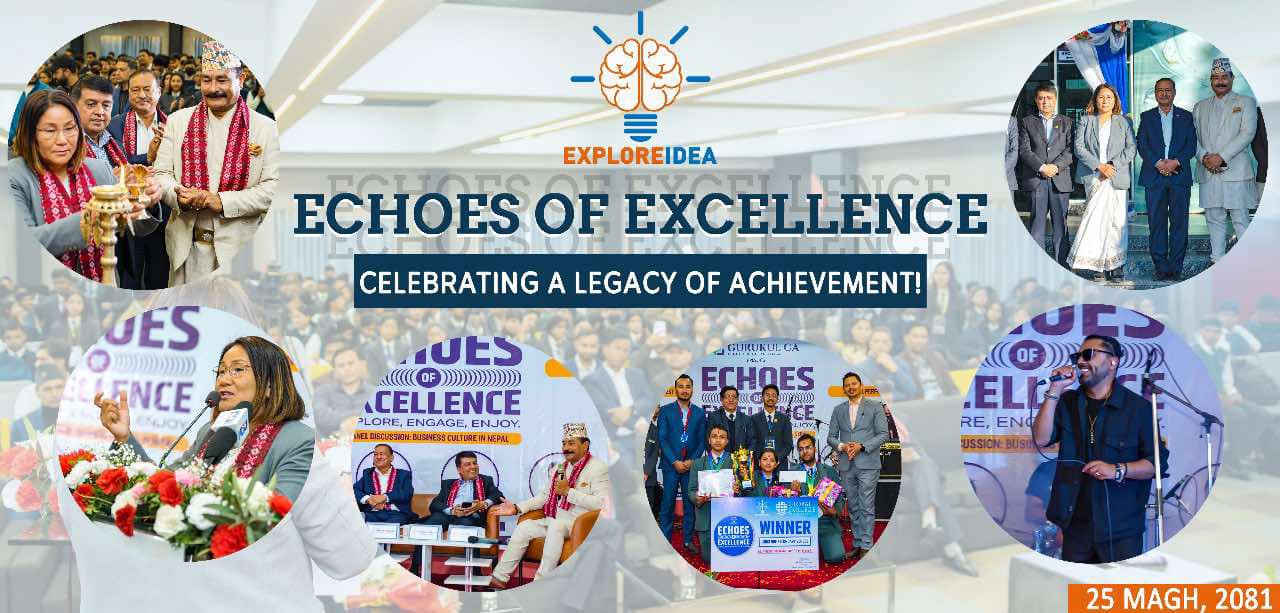 ग्लोबल कलेजको सभा हलमा Explore Idea द्वारा आयोजित “Echoes of Excellence: Explore, Engage, Enjoy” कार्यक्रम भव्य रूपमा सम्पन्न भएको छ। कार्यक्रमलाई प्रमुख प्रायोजक गुरुकुल सि ए, ए सि सि ए पार्टनर सर्टिफाइड कलेज अफ अकाउन्टेन्सी (सि सि ए) लगायत विभिन्न साझेदारी संस्थाहरुले प्रायोजन गरेका थिए। कार्यक्रम तिन चरणमा सम्पन्न भएको थियो, जसअन्तर्गत पहिलो चरणमा Idea Pitching Contest, दोस्रो चरणमा “Business Culture in Nepal” विषयक अन्तरक्रिया कार्यक्रम र तेश्रो चरणमा Kali Prasad Baskota & Sathi Bhai को साङ्गितिक प्रस्तुती एवं मनोरञ्जनात्मक कार्यक्रम समावेश थिए।