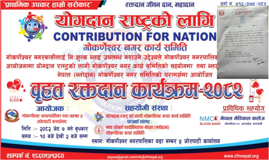 कार्यक्रम जेठ ७ गते भोलि बिहान १०:०० बजे देखि दिउँसो २:०० बजे सम्म गोकर्णेश्वर नगरपालिका वडा नं.५ को प्राङ्गणमा रक्तदान कार्यक्रम आयोजना गरिनेछ।