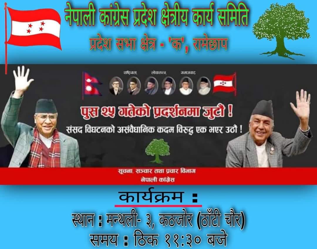 उनका अनुसार बिरोद्ध सभा बिहान ११ : ३० बजे आयोजना गरिएको छ । राष्ट्रपति बिधादेवी भण्डारीले प्रधानमन्त्रीको सिफारिशमा गत पुष ५ गते आइतबारबाट प्रतिनिधि सभा विघटन गरेपछि कांग्रेसले देशब्यापी पर्दशन गर्दै आईरहेको छ । सोही कार्यक्रम अन्तरगर प्रदेश “ख” ले शक्ति प्रर्दशन गर्न लागेको सचिव खड्काले बताए ।